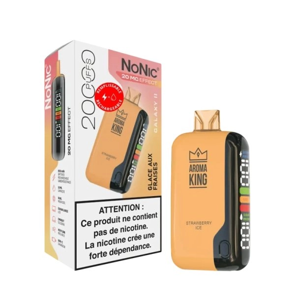 La puff Aroma King Galaxy 11 Fraise Givrée garantit une sensation de hit authentique sans nicotine, grâce à la technologie « No Nic » équivalente à 20 mg ou 50 mg. Elle offre jusqu’à 20 000 bouffées grâce à son réservoir de 16 ml, et propose trois modes de puissance (Eco, Normal, Turbo) pour une expérience sur mesure. Sa batterie rechargeable de 650 mAh en USB-C et sa résistance Dual Mesh 1 ohm assurent une vapeur dense et des saveurs glacées intenses de fraise. Rechargeable et remplissable, elle combine praticité, performance et plaisir fruité.